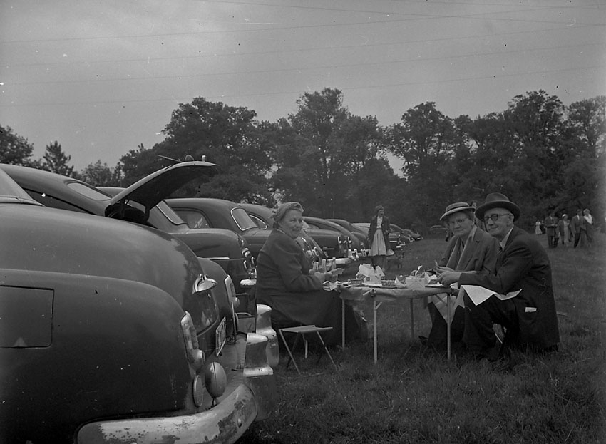 Ett sällskap sitter på en parkering och fikar i väntan på