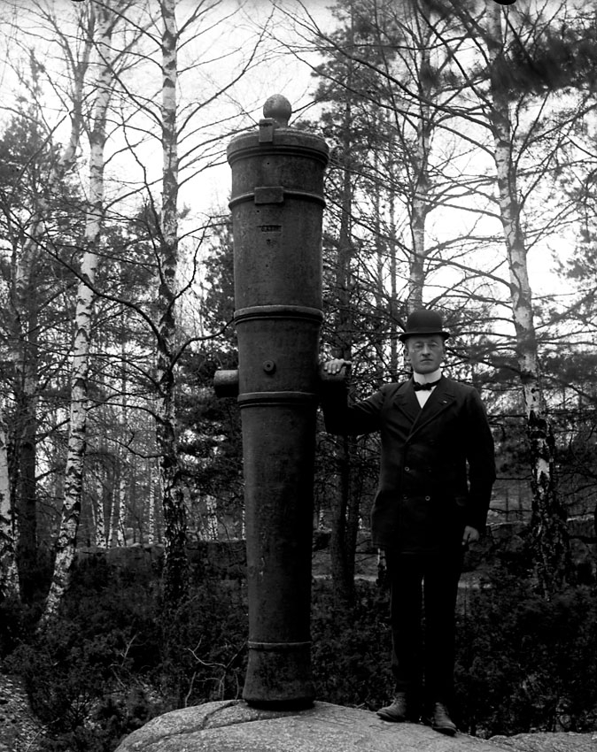 Man stående vid kanonrör på Djäkneberget, Västerås.