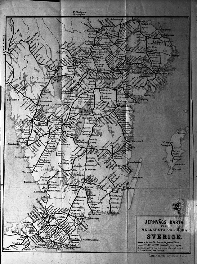 En järnvägskarta över mellersta och södra Sverige.