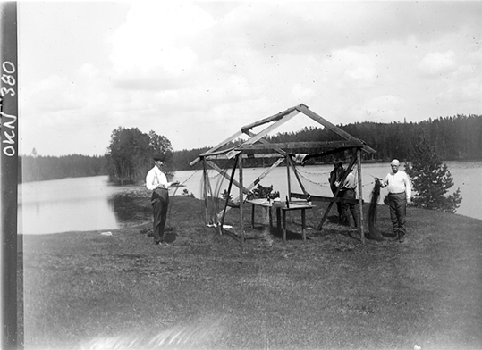 Fyra män vid fiskenät till torkning, Riddarhyttan.