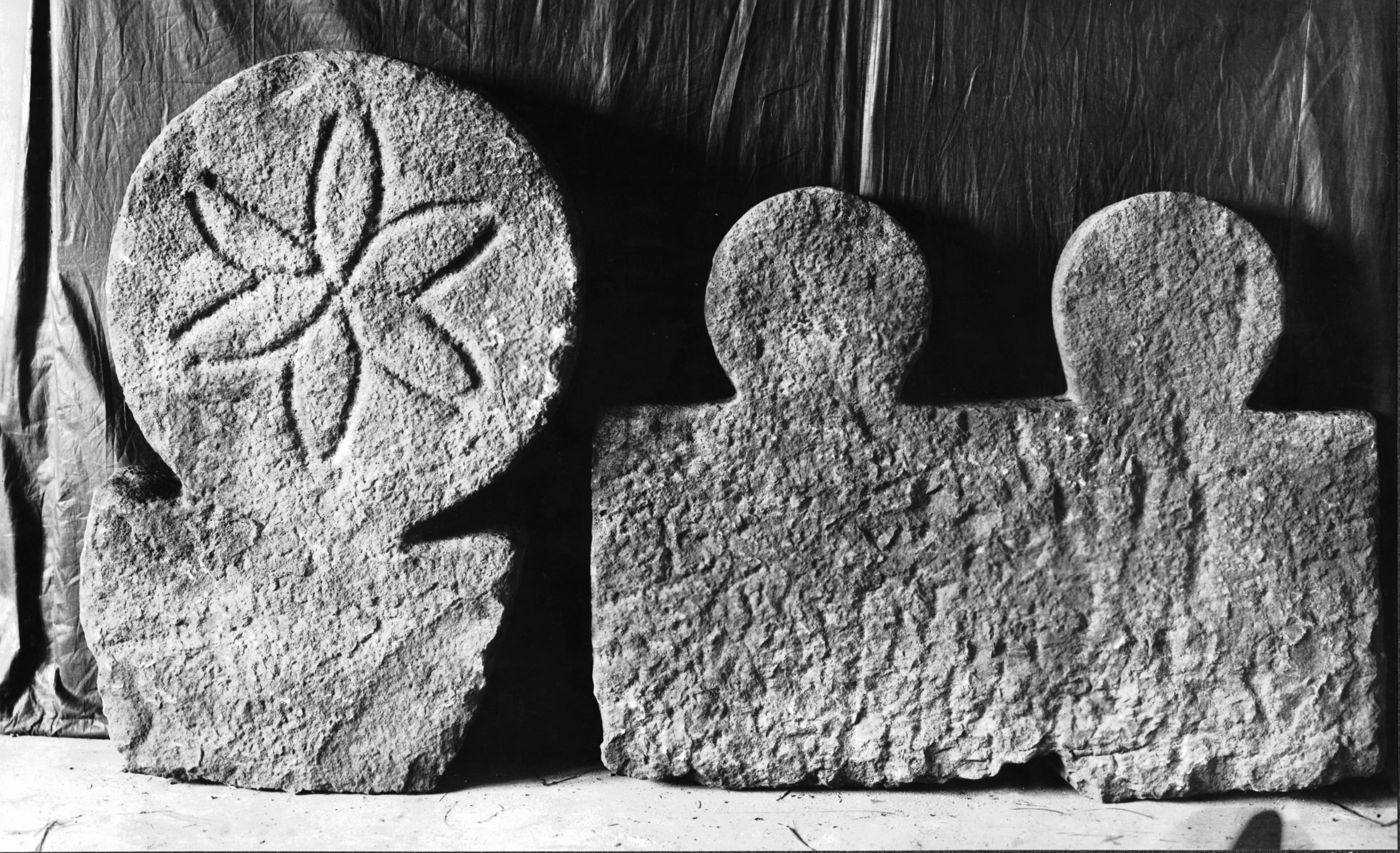 Gavelhällar av sandsten från äldre medeltida grav.