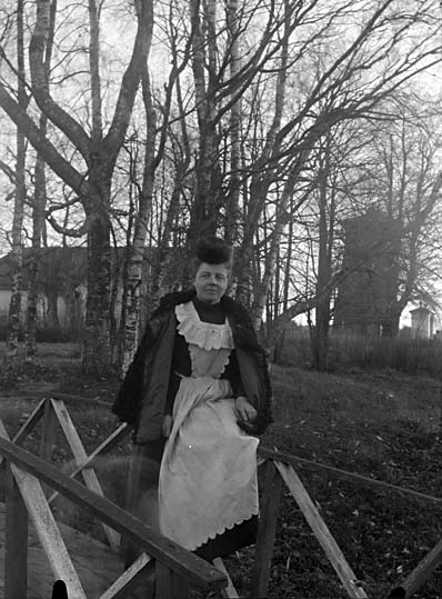 Eva Timm sittande på broräcke vid prästgården, Lillhärad.