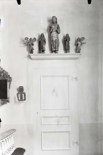 Skulpturer uppsatta över dörr i koret, Gunnilbo kyrka, Skinnskatteberg.