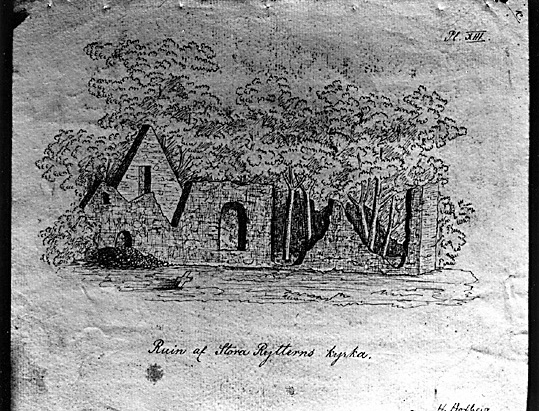 Stora Rytterns kyrkoruin Västerås, tecknad av H Hafberg.