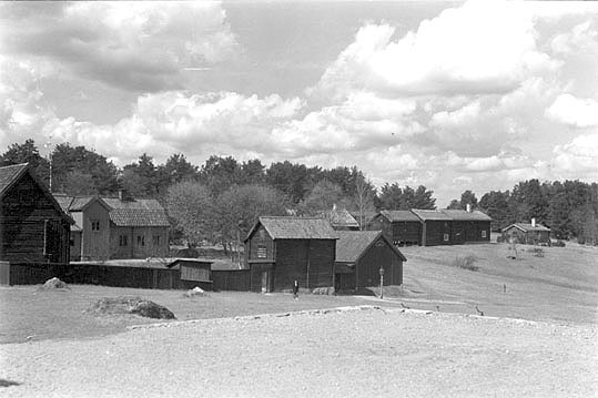 Utsikt över museet från herrgården, Vallby friluftsmuseum i Västerås.
