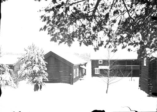 Korshyttan och Korsbergahuset, i vinterskrud, på Vallby friluftsmuseum i Västerås.