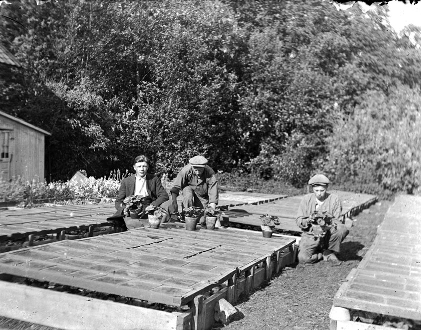 Trädgårdsarbetare vid drivbänkar med prydnadsväxtodling.