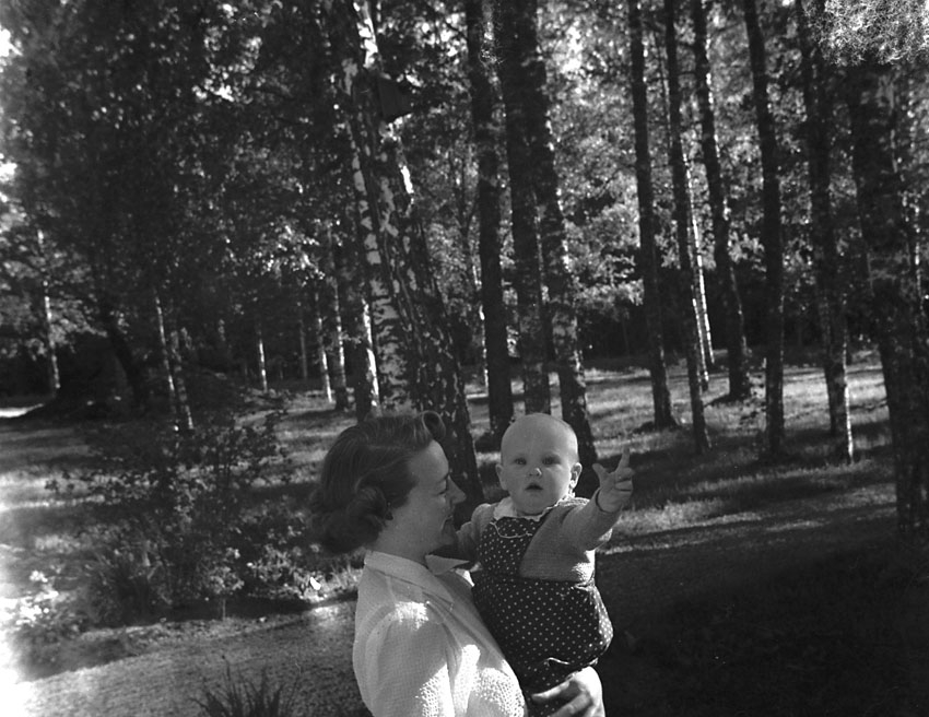 Mor med barn i famnen.