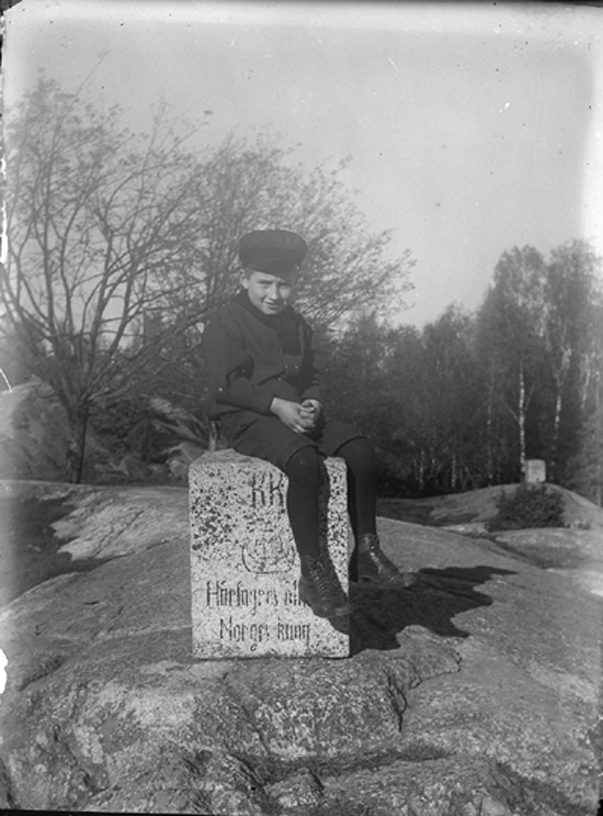 Pojke sitter på en sten, Djäkneberget, Västerås.