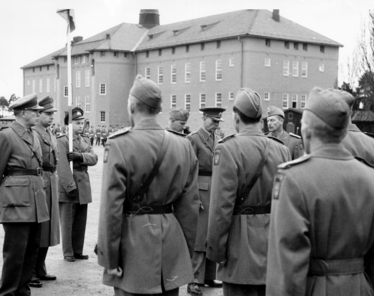 Bild 1: Chefen Armén, general Thord Bonde, inspekterar FN-bataljon XI G (Gaza). Vi ser kapten Jan Toll som CA:s standarförare.