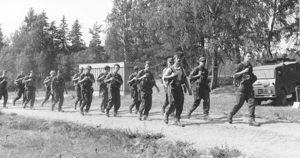 Titel: Förflyttning P 10 Strängnäs - Skarpnäck Stockholm Soldater och befäl på marsch.