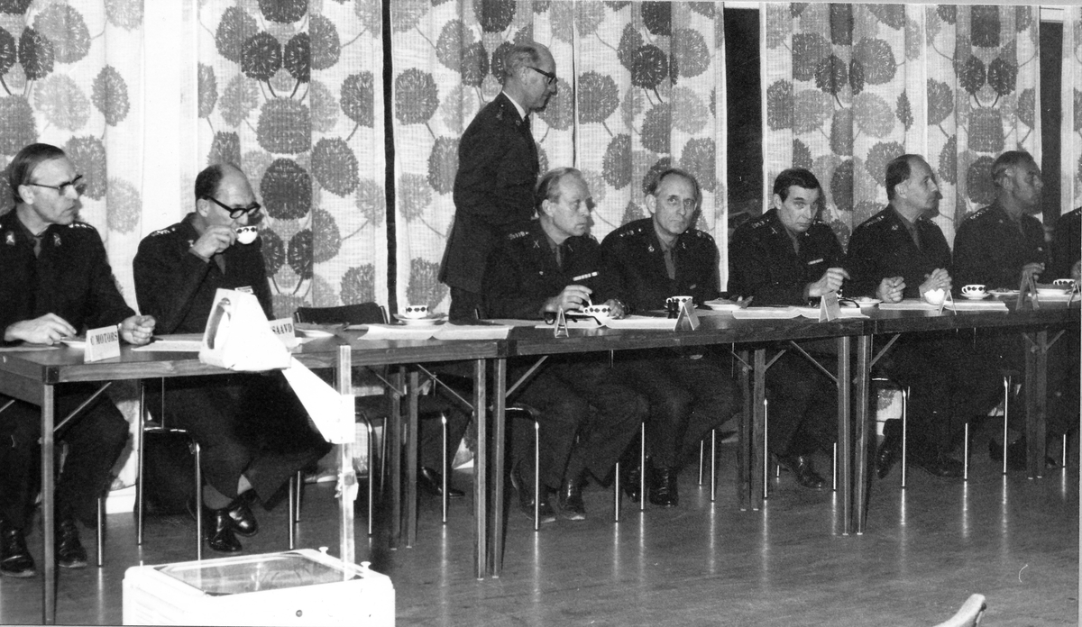 Bild 2: Soldhemfst Eive Johansson, okänd, öv Stig Colliander, mj Agne Lannerhed, övlt Ragnar Tauvon, mj Jan Toll, mj Göran Persson, kn Sven-Olov Svensson, fj Gustaf Muthas