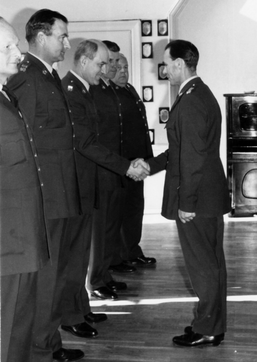 Kapten Bertil Henriksson tillträder tjänst vid regementet och hälsar här på underbefälskåren. Alla nedan är rustmästare.