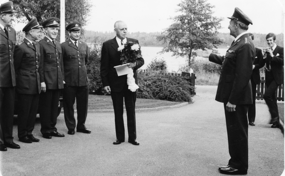 Regementschefen och några officerskamrater på villauppfarten invid Mälaren.