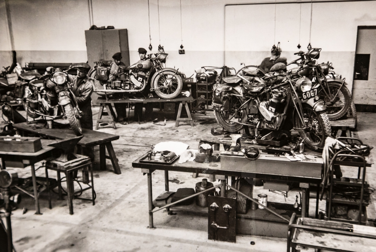 Arbetsbänkar med flera Mc m/42. På bänken till h ser vi en Mc m/42 TV och till vänster och i mitten Mc m/42 SV