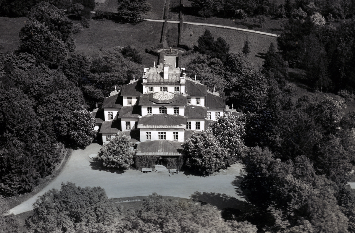 Flygfoto över Stävlö i Åby s:n. Herrgården med parken och åkrar. Helbild och beskuren som vykort.