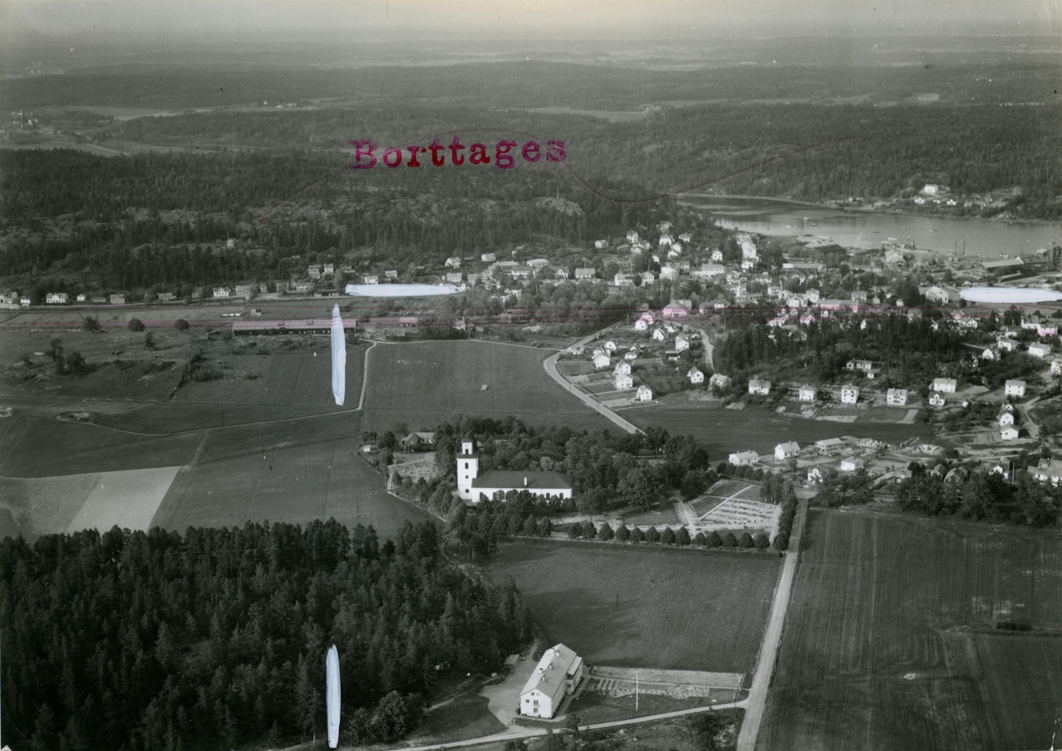 Flygfoto över Gamleby. Området innanför markeringarna har använts som vykort.