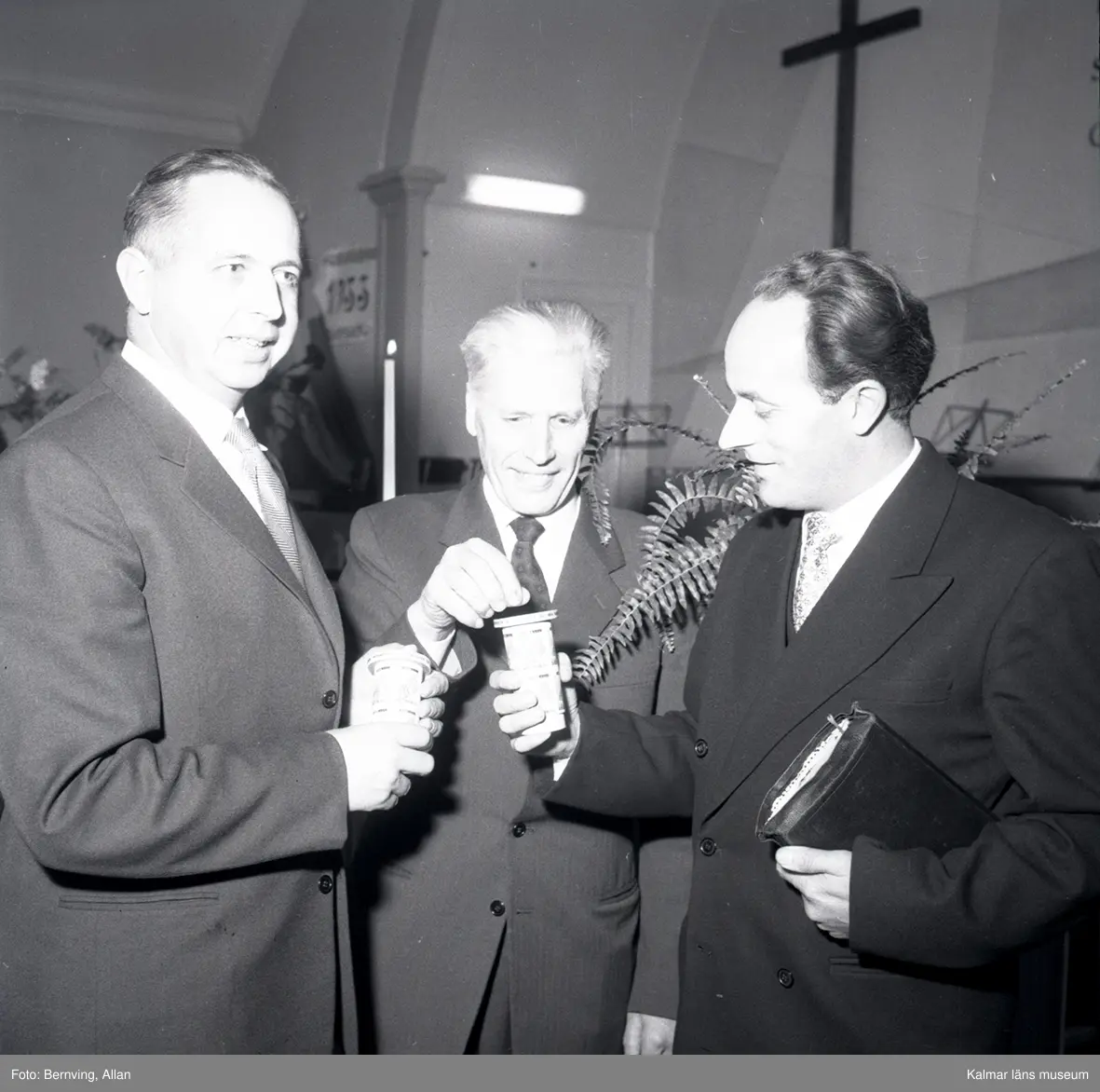 Tre herrar i kostym. Stoppar mynt i en bössa när Filadelfiakyrkan firade 25 år.