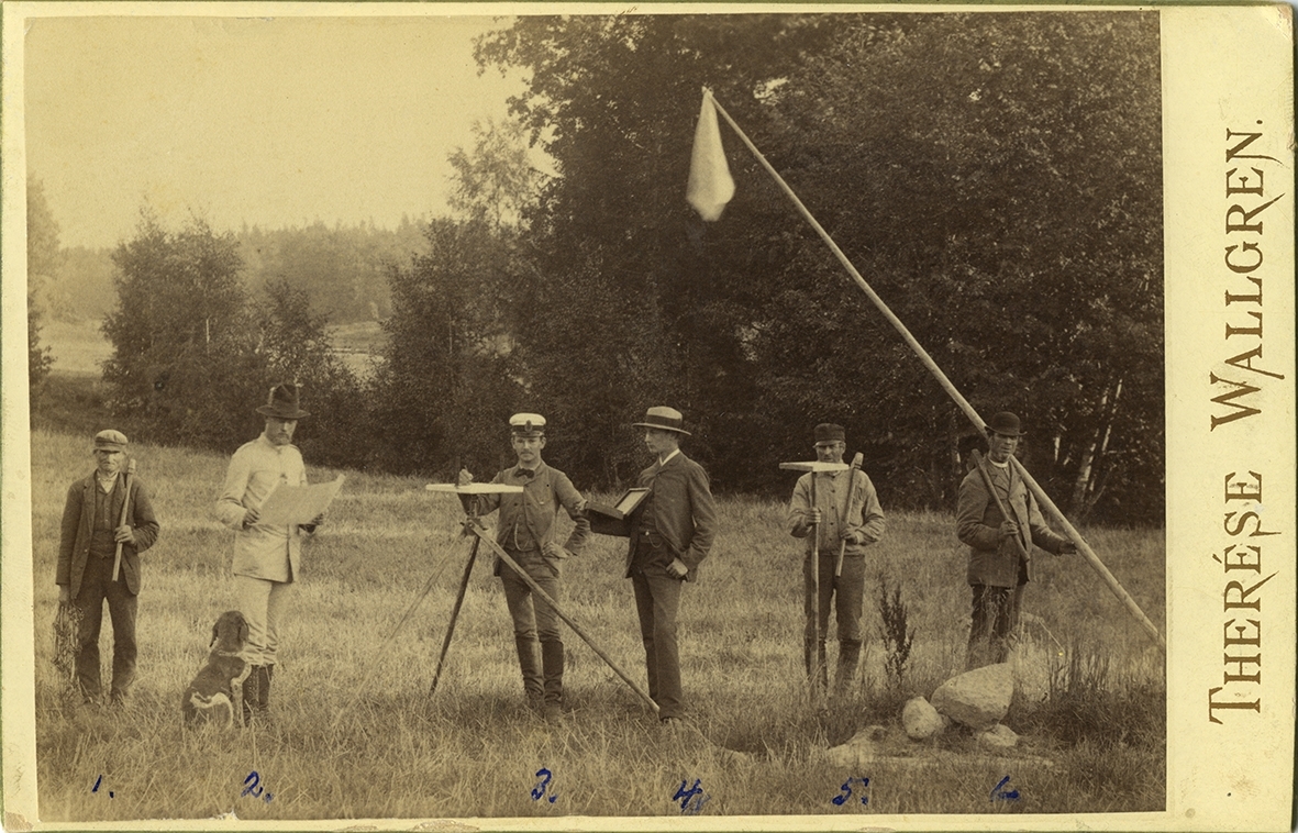 Lantmäteriförrättning. Typisk pose för att illustrera yrket.