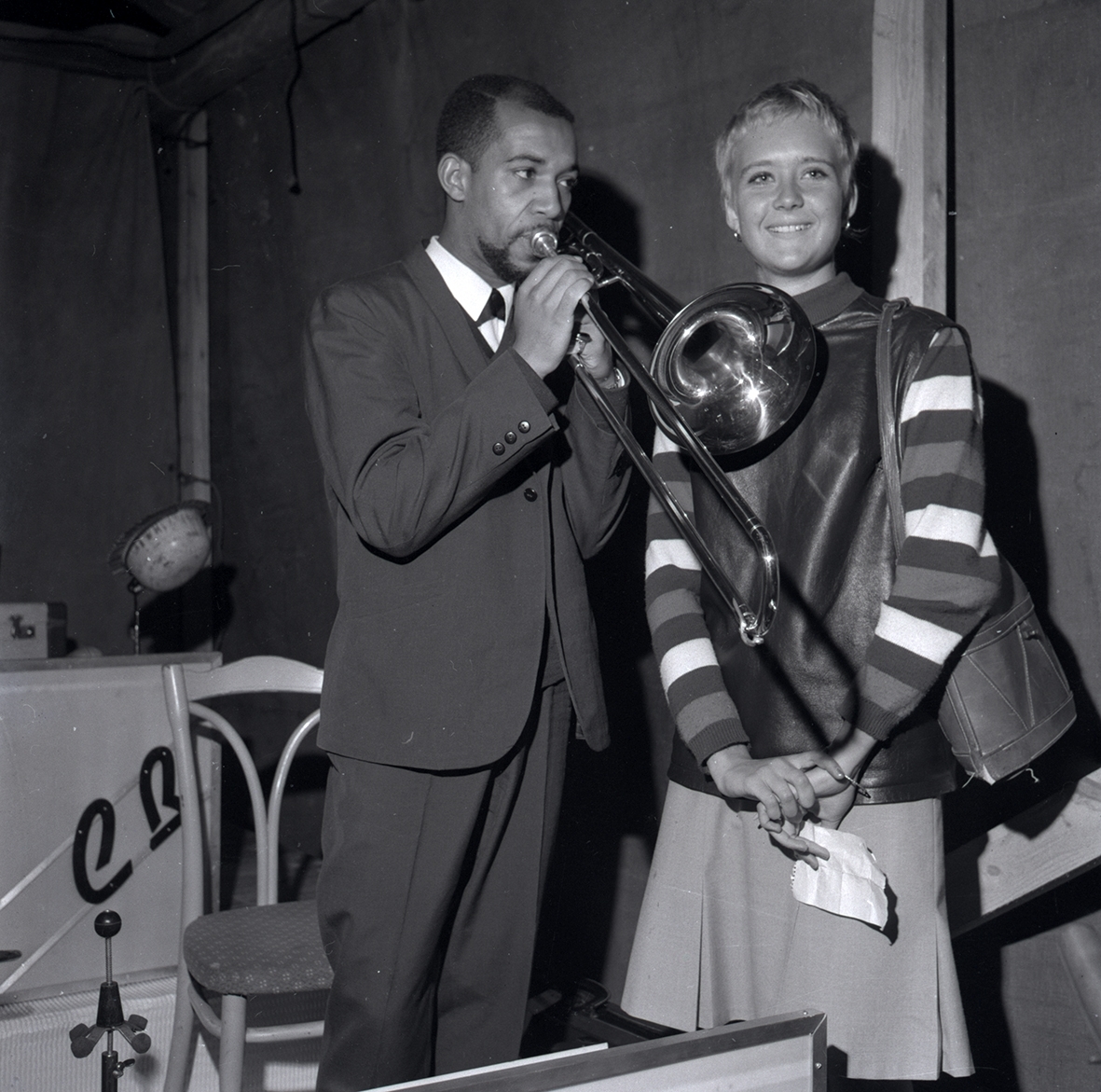 En man ur Count Basies orkester som spelar trumpet och en kvinna.