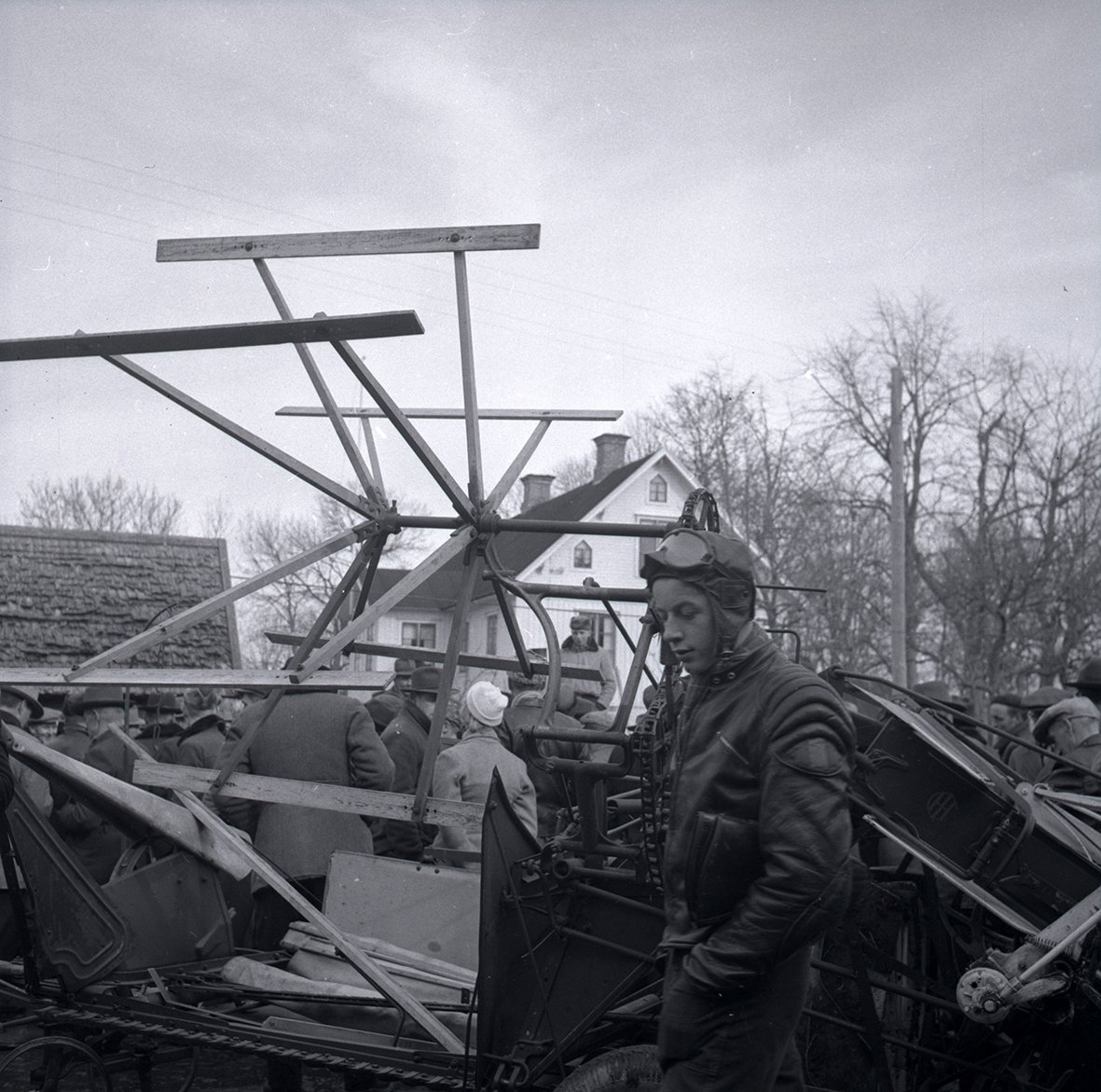 Auktion i Kvarnstad, Källa. En ung man i motorcykelhuva tittar på en självbindare.