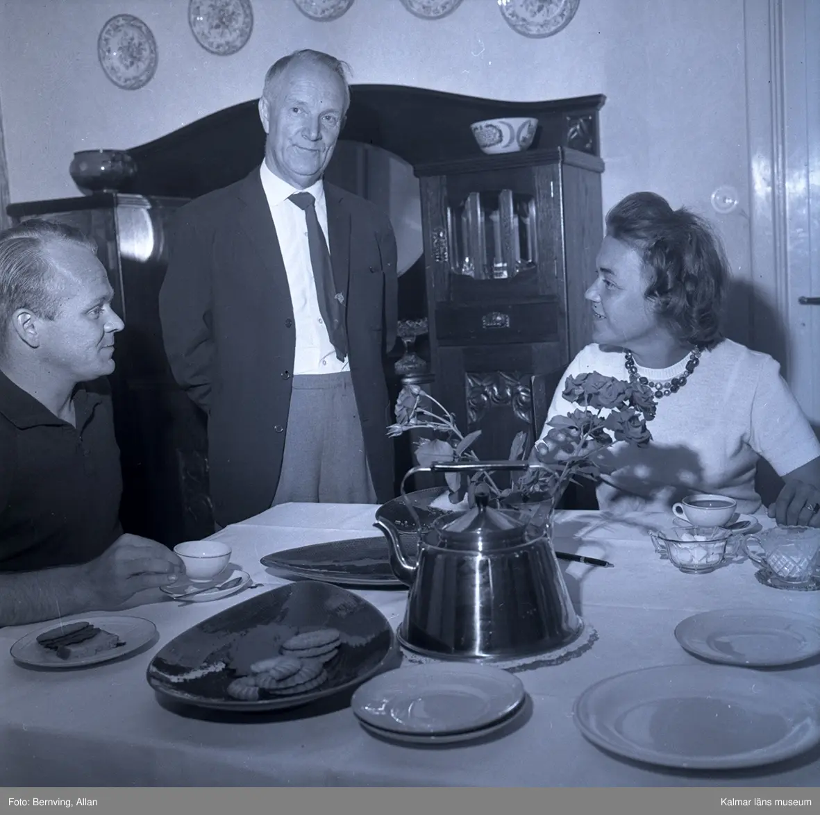 Gunnar Hedlund i Rådom stående i mitten. Med personer som dricker kaffe i Byxelkrok.