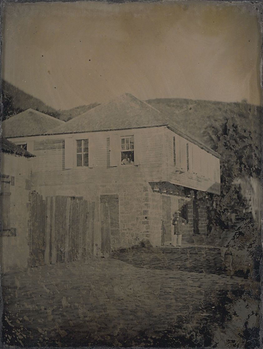 Man utanför bostadshus i Gustavia, Saint-Barthélemy. Två kvinnor tittar ut genom ett fönster.