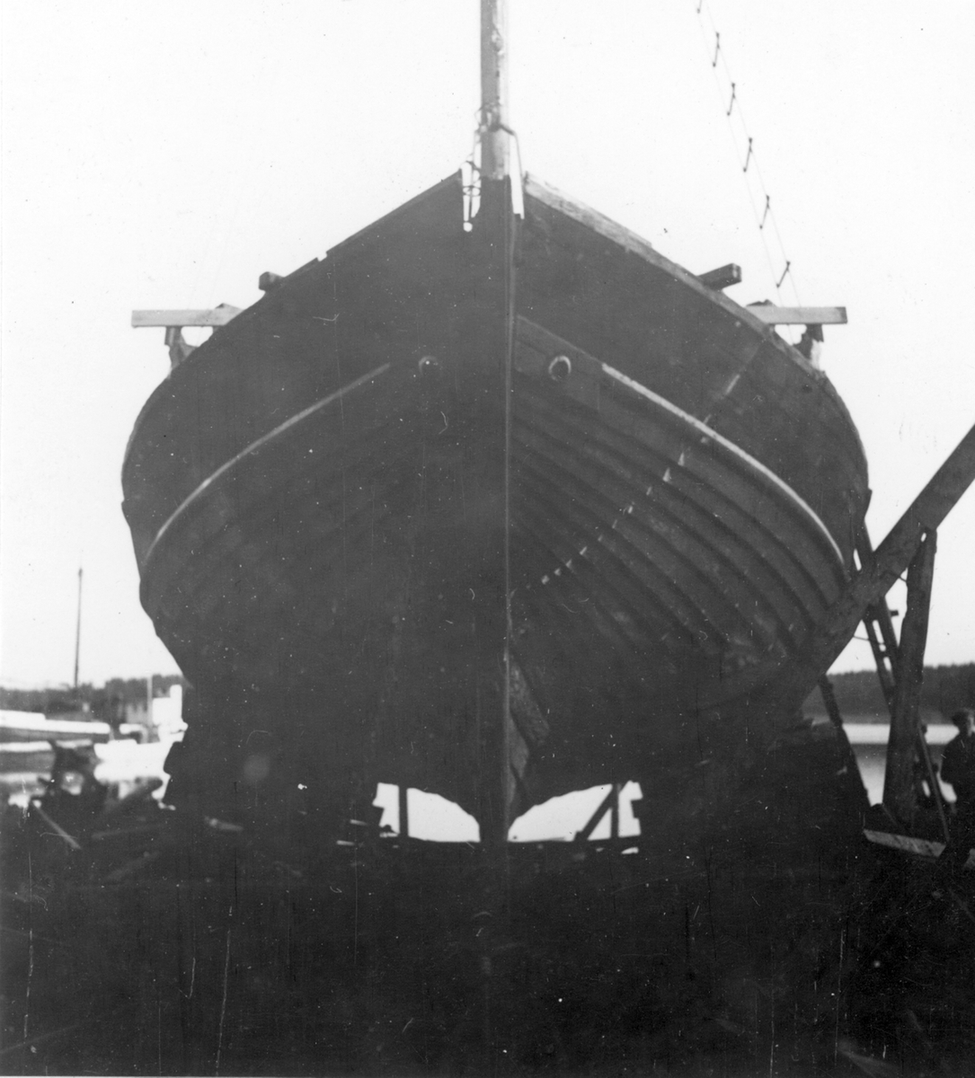 Uppland, Stockholms län, Frötuna skeppslag, Länna socken, Vettershaga. Vedjakten Adalia på Bergshamra varv. Skrovet sett förifrån. Foto i juni 1950.