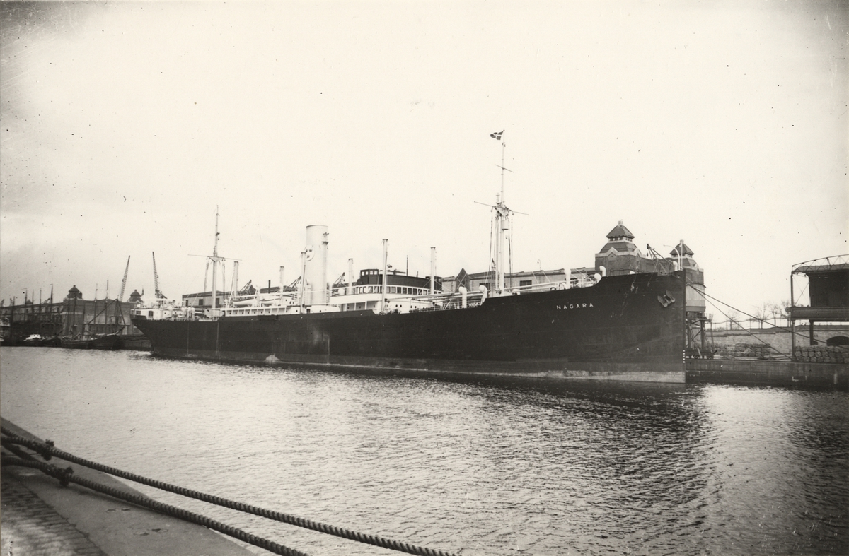 Foto i svartvitt visande lastmotorfartyget "NAGARA" av Göteborg, vid kaj i Köpenhamn, troligen under 1930-talet.