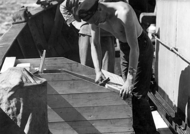 Göteborgs Örlogsdepå. HM Hjvb 384. Kocken har behov av en islår för förvaring av ömtåliga matvaror. Fartygets civile maskinist och timmerman ombord ses här i färd med att förfärdiga den efterlängtade islåren. Fil lic Gunnar Jonssons undersökningsresa till västkusten juni 1940. 109.