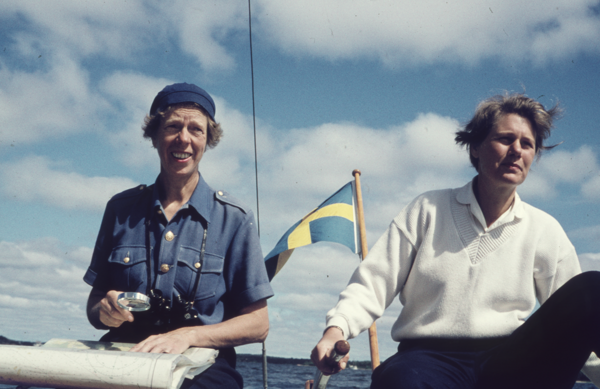 Karin Palmér till vänster i sin folkbåt KARP. Ellen "Bille" Biloff till höger.