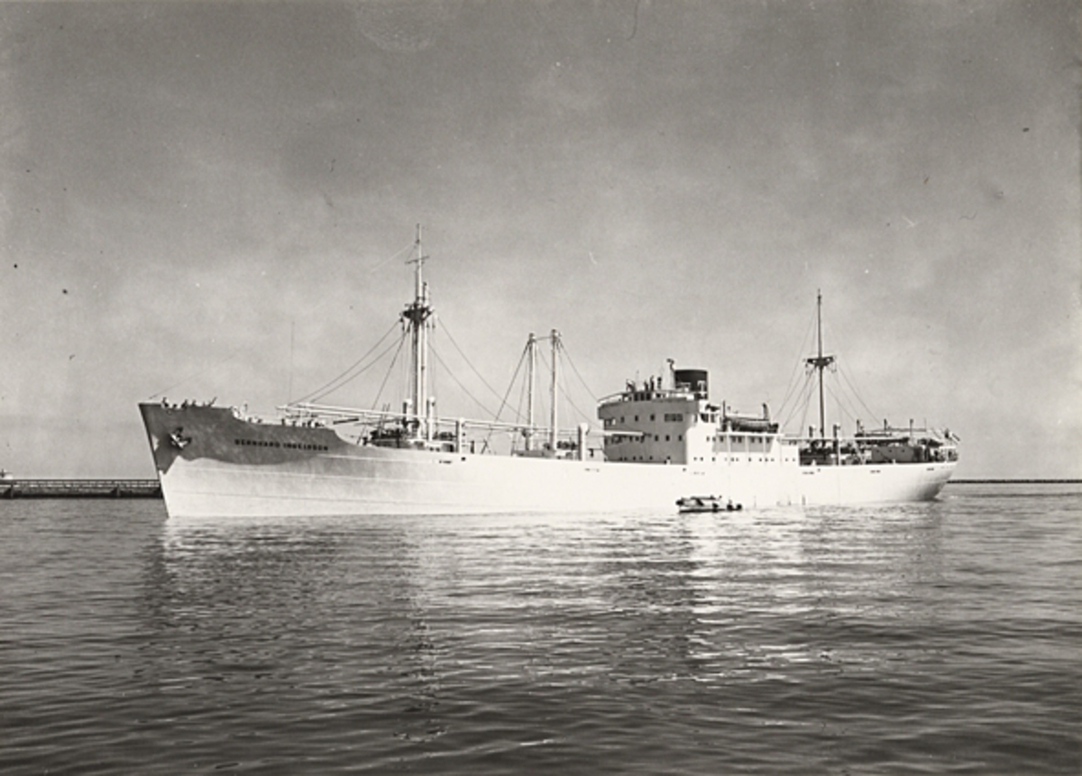 Foto i svartvitt visande lastångfartyget "BERNHARD INGELSSON" i Köpenhamn år 1953.