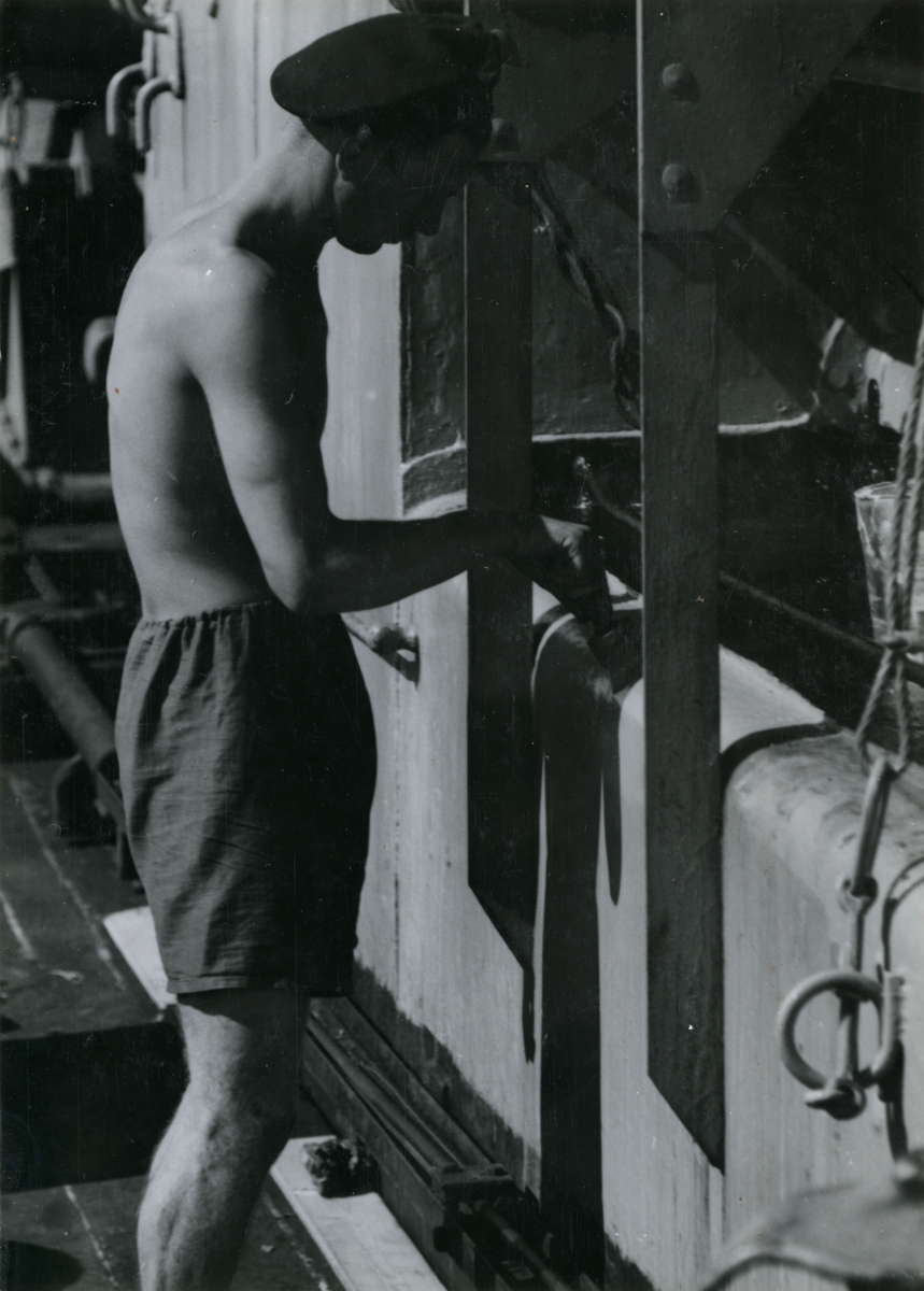 Göteborgs Örlogsdepå. HM Hjvb 384. Underhållsarbete. Maskinöverbyggnaden målas. Enär fartyget icke tillhör Kronan, utan förhyrts, måste det målas om med den blågråfärg, som användes inom Flottan. Fil lic Gunnar Jonssons undersökningsresa till västkusten juni 1940. 106.