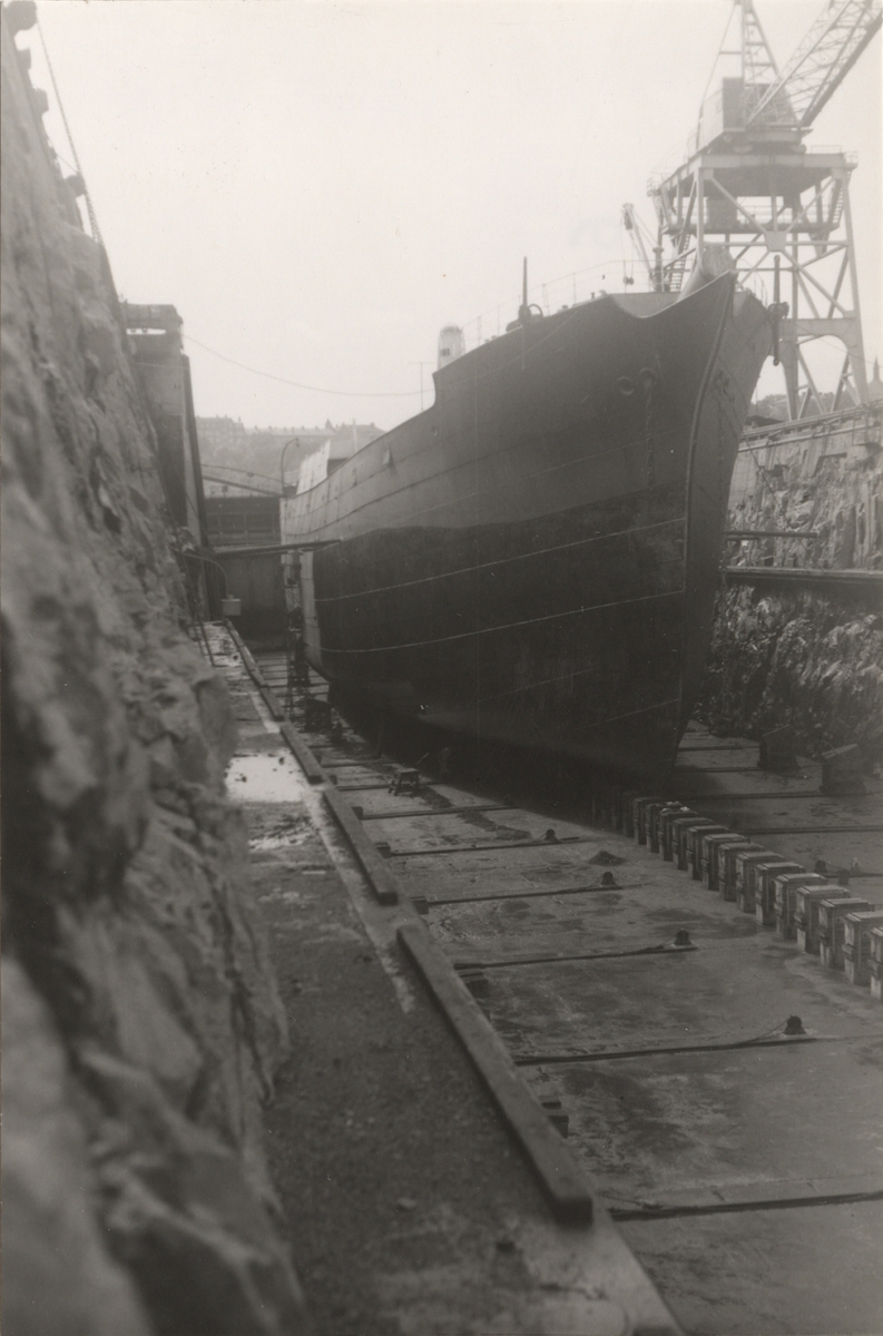 Titel: F.d. 4-mastbarken MOSHULU i Gustav V:s docka på Beckholmen 1961. Fartyget avriggat för användning som magasinsfartyg.