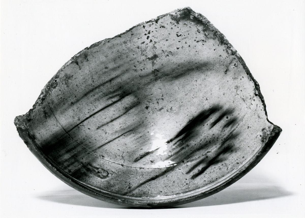 "På insidan gulgeige glasyr med röda och gröna parallela färgstrimmor."