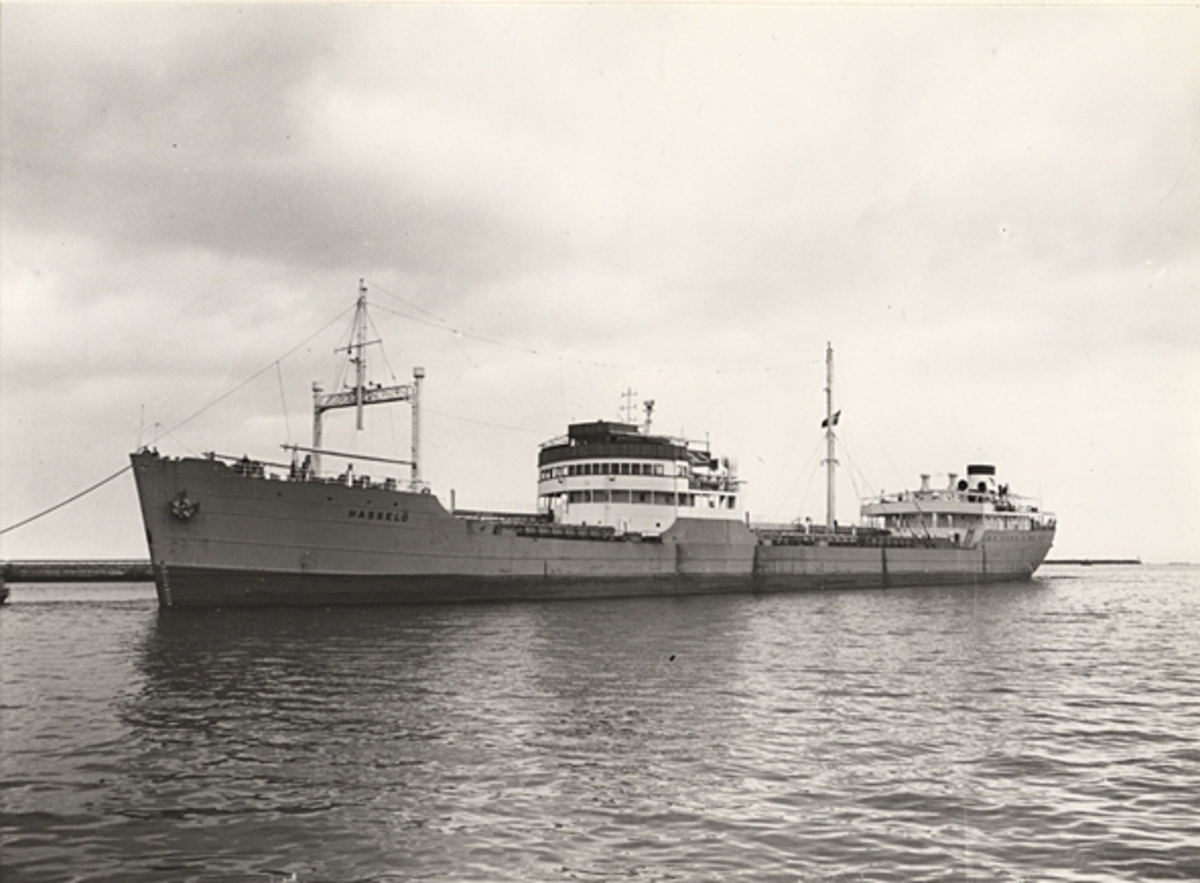 Foto i svartvitt visande malmtankmotorfartyget "HASSELÖ" taget i Köpenhamns hamn den 10.2.1955.