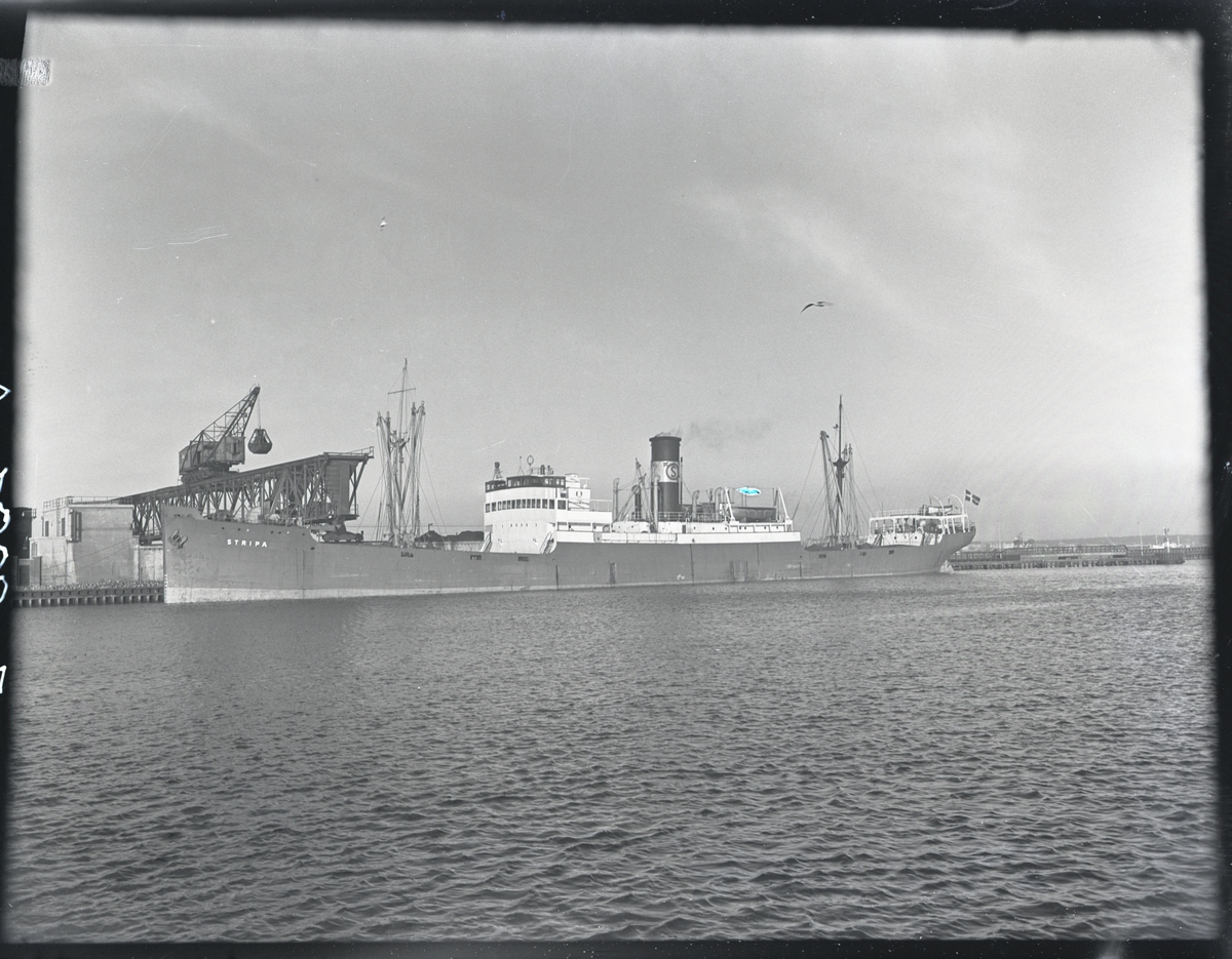 Foto i svartvitt visande lastångfartyget "STRIPA" i Köpenhamn den 12.1.1955.