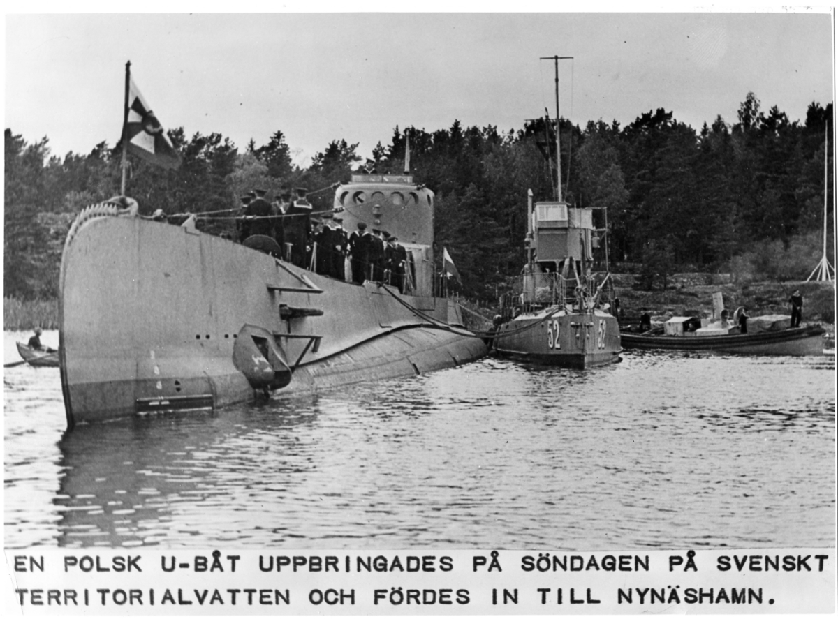 [fjärrskrivartext:] "En polsk U-båt uppbringades på söndagen på svenskt territorialvatten och fördes in till Nynäshamn."