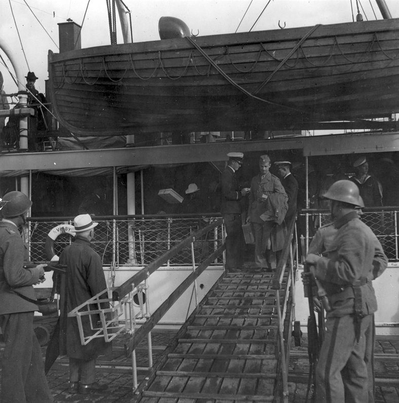Passagerarnas identitet kontrolleras noga före landgåendet. I land vid landgången postera en maskinpistolsskytt och en med handgranater och gevär beväpnad gevärsskytt. Fil lic Gunnar Jonssons undersökningsresa till Gotland 1940.