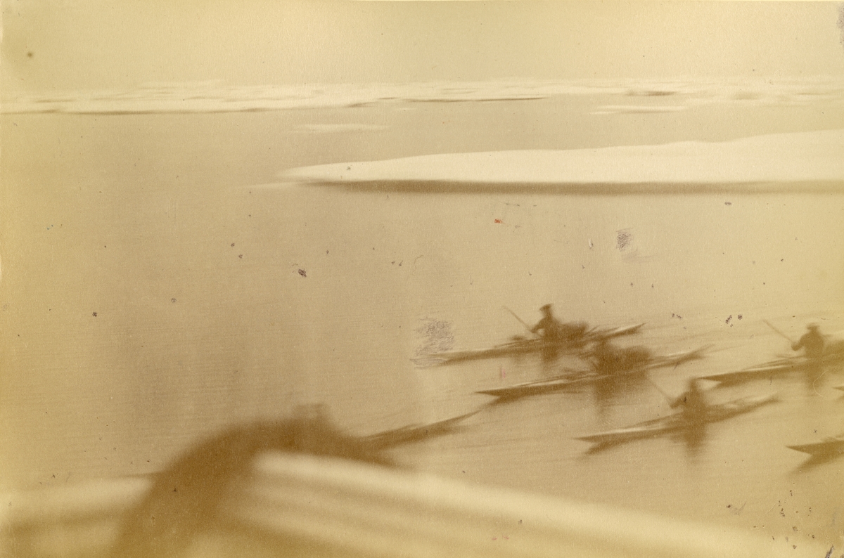 Svenska Grönlandsexpeditionen 1883. Grönländare i kajaker möter expeditionsfartyget, kronoångaren SOFIA, i Julianenhaab.