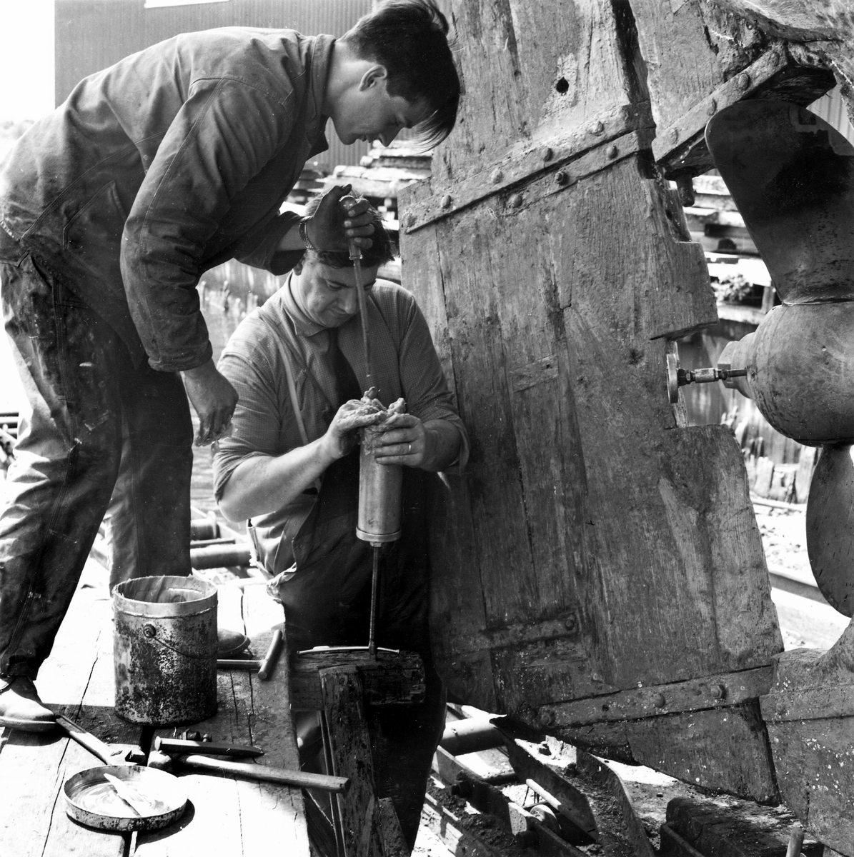 Propellern skall infettas och fettsprutan fylles. Uno Jönsson och John Löfström.