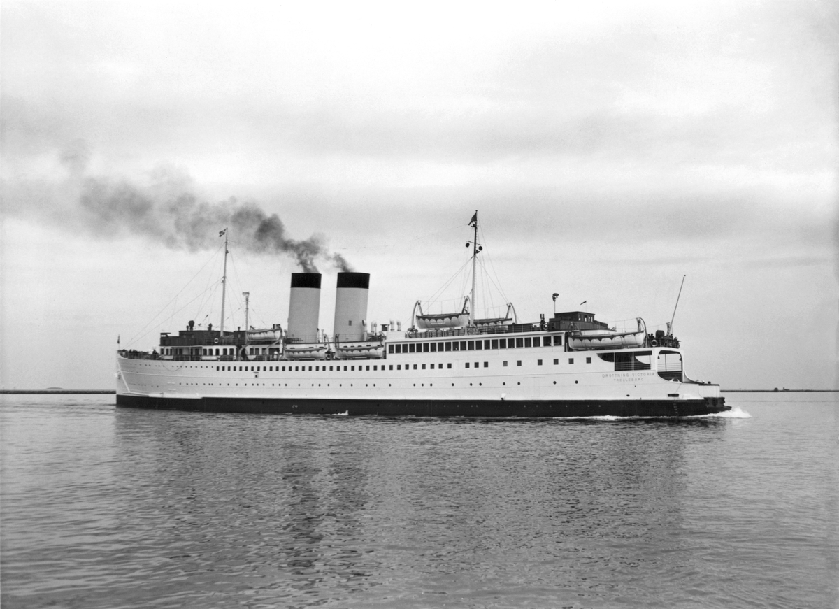 Foto i svartvitt visande tåg-ångfärjan DROTTNING VICTORIA i Köpenhamn.