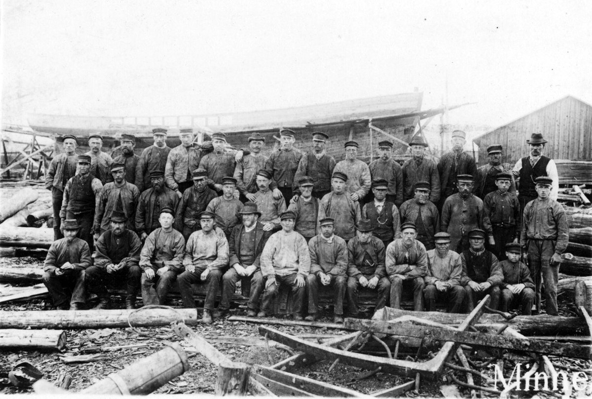 Foto av foto hos förre varvsarbetaren Fredrik Nilsson. Arbetarna på Södra Garns varv vid tiden omkring 1900.