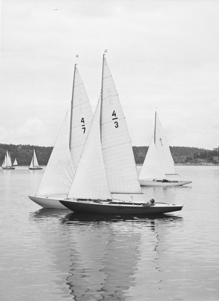 I förgrunden 4-metersjakten SKUM under KSSS poängseglingar i Saltsjöbaden hösten 1943.