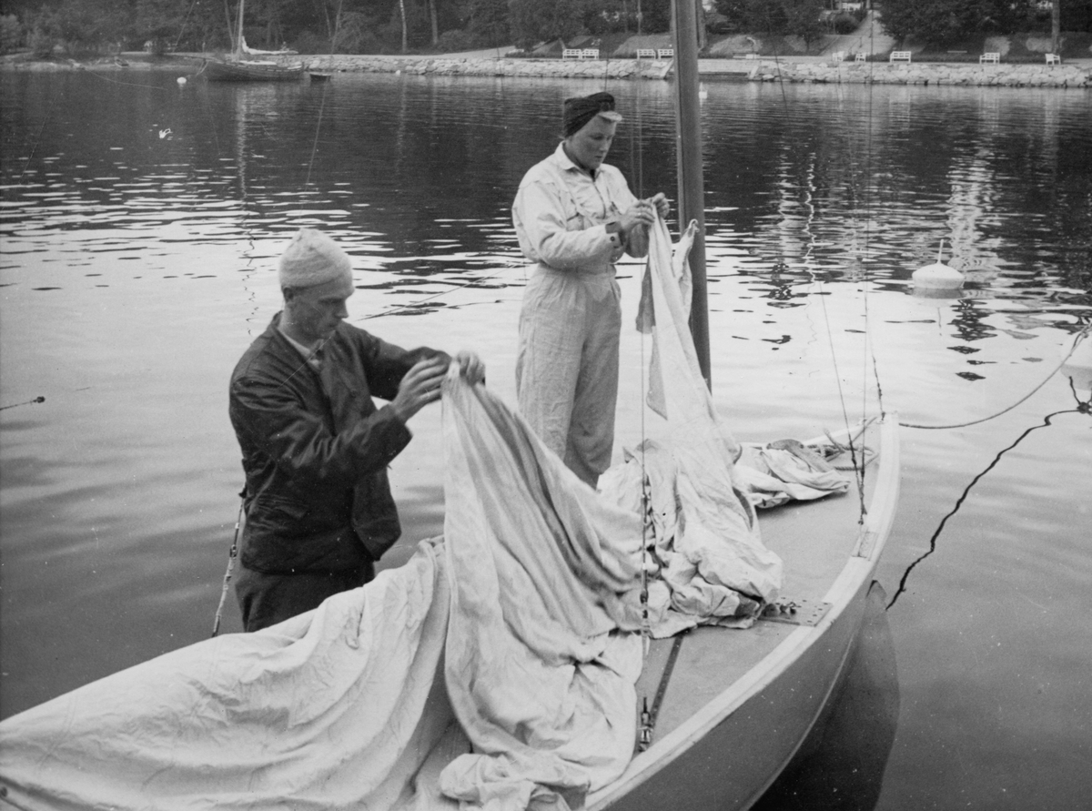 Från Hotellviken, Saltsjöbaden september 1946. Den damsegling som omtalas i baksidesanteckningen ägde rum 7 september. Anteckningen "Seglade för SSK eller Sthlms Starbåtsflottiljen" syftar på Bengt Melin, som var medlem av Stockholms Segel Klubb, hans hustru Inger seglade för Stockholms Segel Sällskap (KSSS årsbok 1947 s 222). I seglingsprotokollet anges fru Bengt Melins namn som Inga, men Melins svåger, tillika SSHM-medarbetaren Folke Sjödin, som gjort anteckningen, har uppgivit hennes namn som Inger. Jfr Fo157054 och -055 i KSSS-samlingen. Fotografiet återgivet i Till Rors årg. XII (1946) nr 37 s 11.