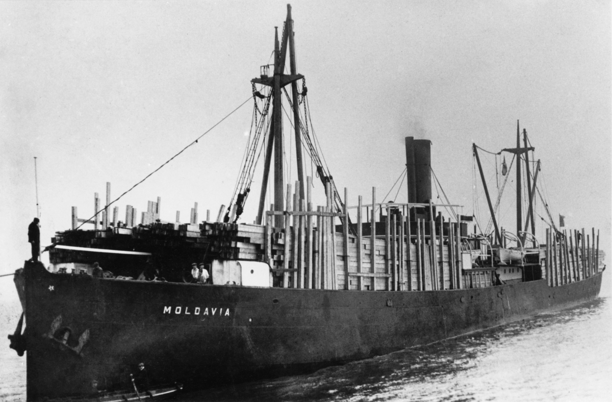Från fotobeskrivning: "Lastångfartyget MOLDAVIA vid Hull i augusti år 1912 med trälast [---] Fartyget gick bl.a. till Vita Havet, Arkangelsk och London. Signal: JMKG Reg.nr: 3927" [---]
