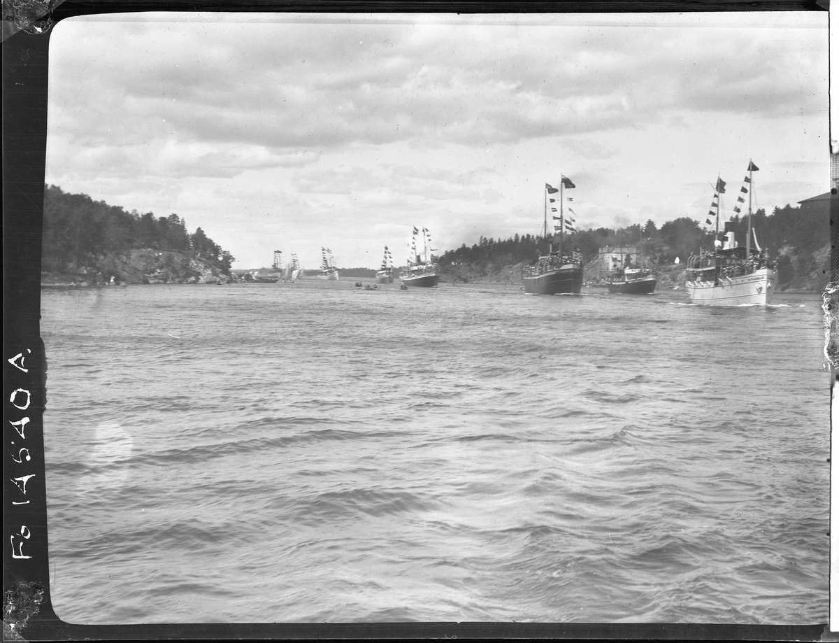 Norr om Oxdjupet (1905) i väntan på DROTT. EXPRESS, GEFLE, NORRTELJE, S G HERMELIN, MARIEFRED, NORRKÖPING, BALDER, ÖREBRO I, JL RUNEBERG, CARL XI OCH OSCAR II.