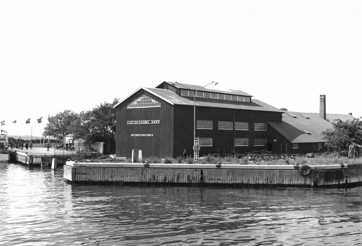 [från fotobeskrivningen:] [---] "Varvet med utrustningskajen och Nyhamnen från S. [---] "Längst t.v. Vikingbåtarbas kaj. [sic]" [---]