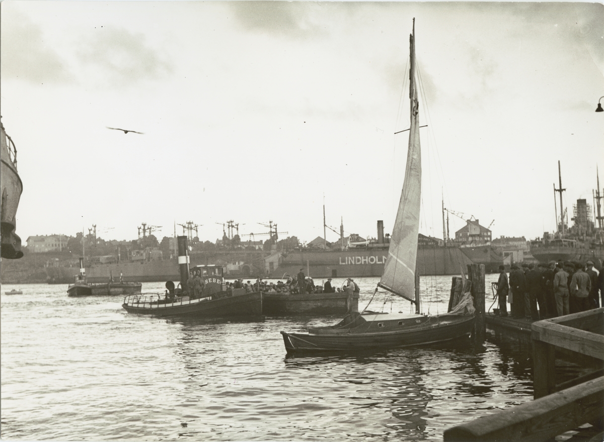 Varvsarbetare transporteras över Göta älv med pråm bogserad av "Hebe"