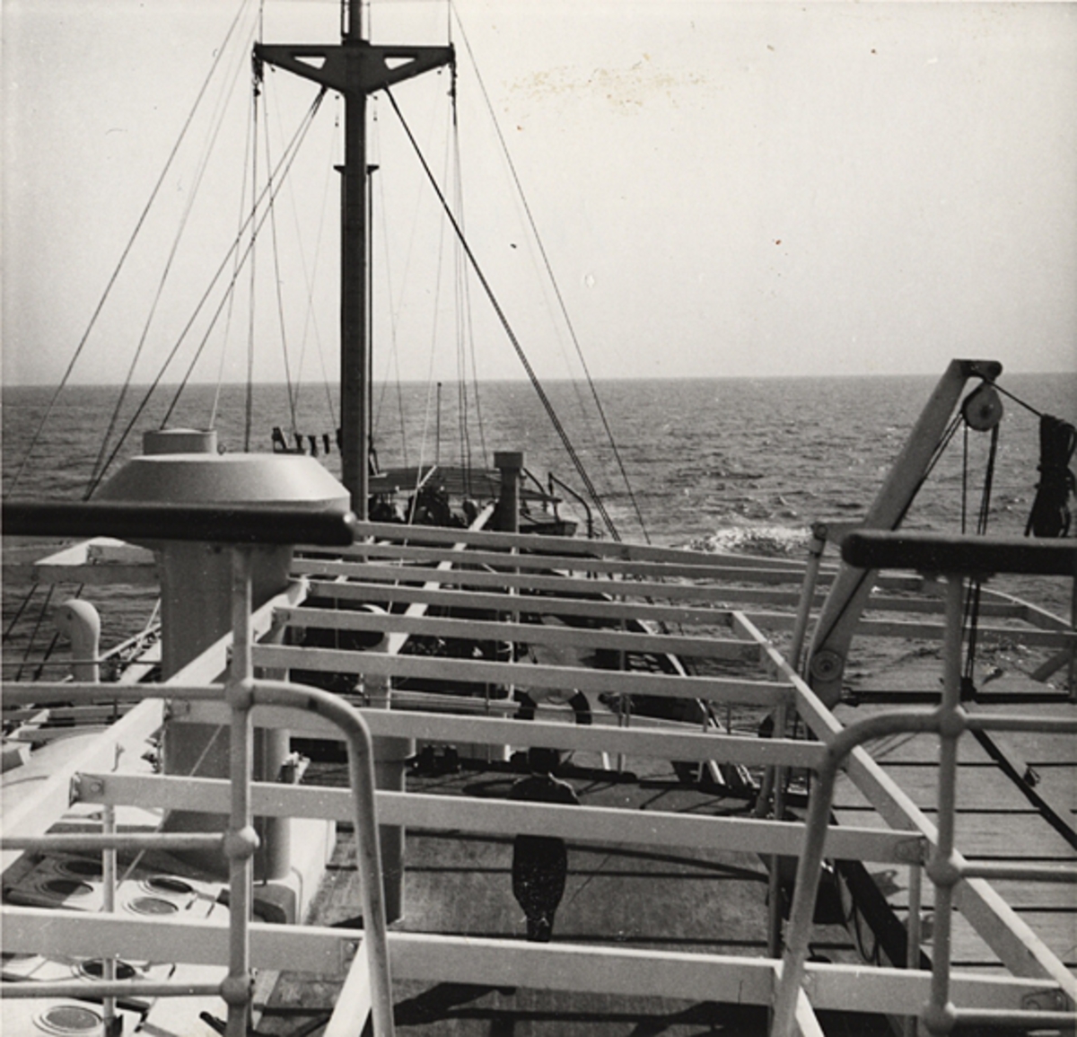 Däcksbild tagen från bryggan på m/s GOLDEN OCEAN av Trelleborg. Fotot visar b.b.sidan av båtdäck samt akterdäck.